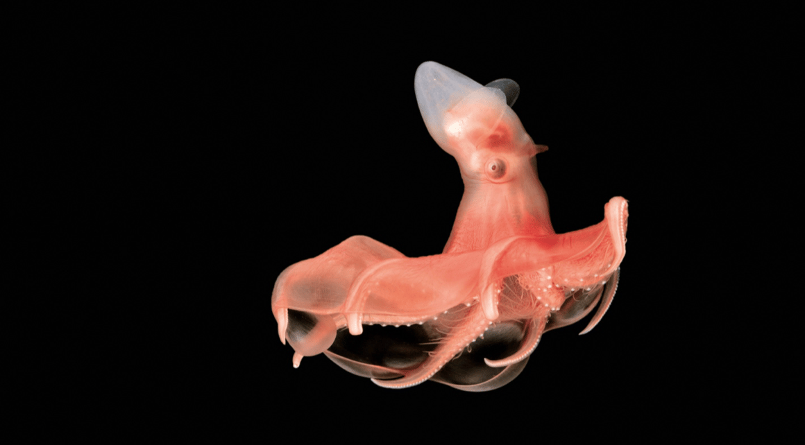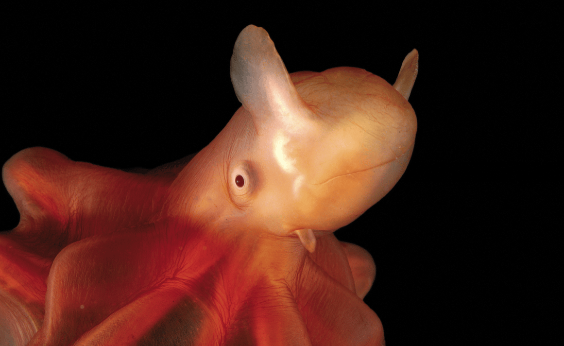 Vous voyez à quoi ça ressemble un poulpe à oreilles ? Et en particulier Stauroteuthis, ce petit poulpe rose gracile, translucide, avec des grandes nageoires arrondies qui ressemblent aux oreilles de Dumbo, et une peau aussi fine qu’une membrane extrêmement fragile qui se déchire au moindre contact ?